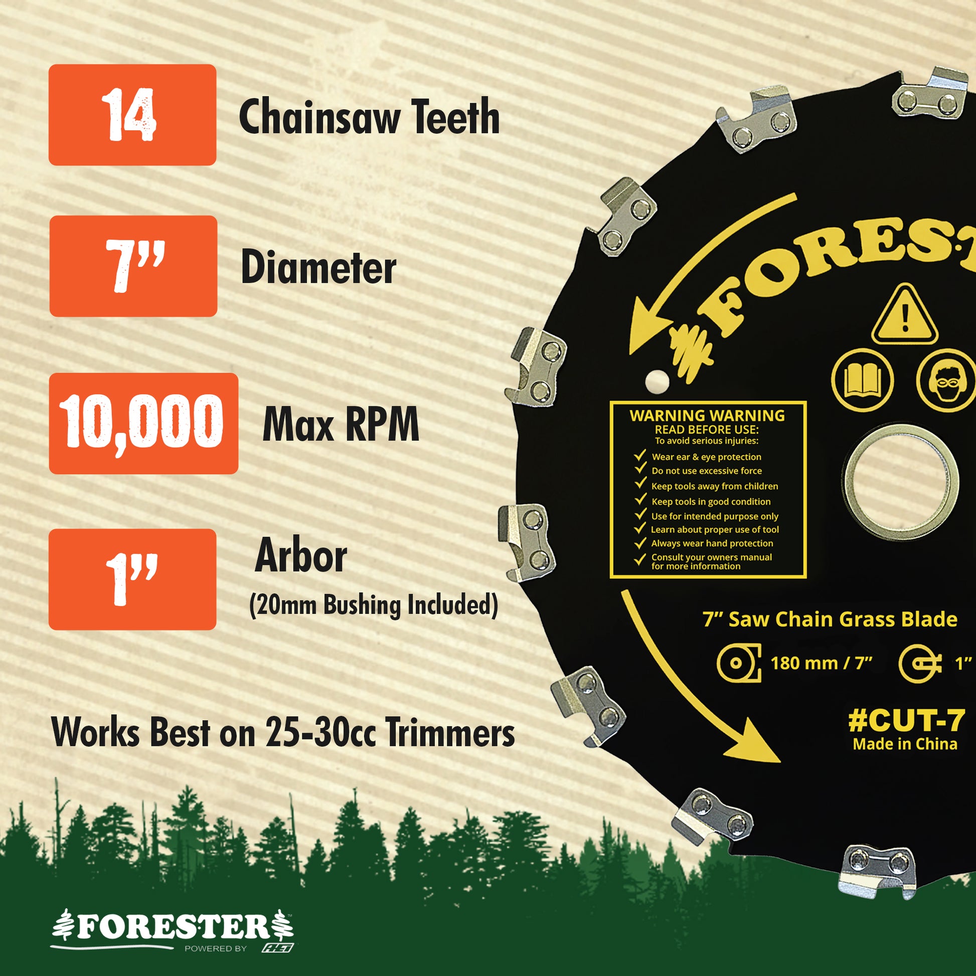 COMPACT 7IN BLADE FOR MAXIMUM CONTROL - The 7-inch blade offers better control and maneuverability in tight spaces. It’s equipped with 14 sharp chainsaw teeth, and works best on low to mid range trimmers (25-30cc) or those with a smaller guard.