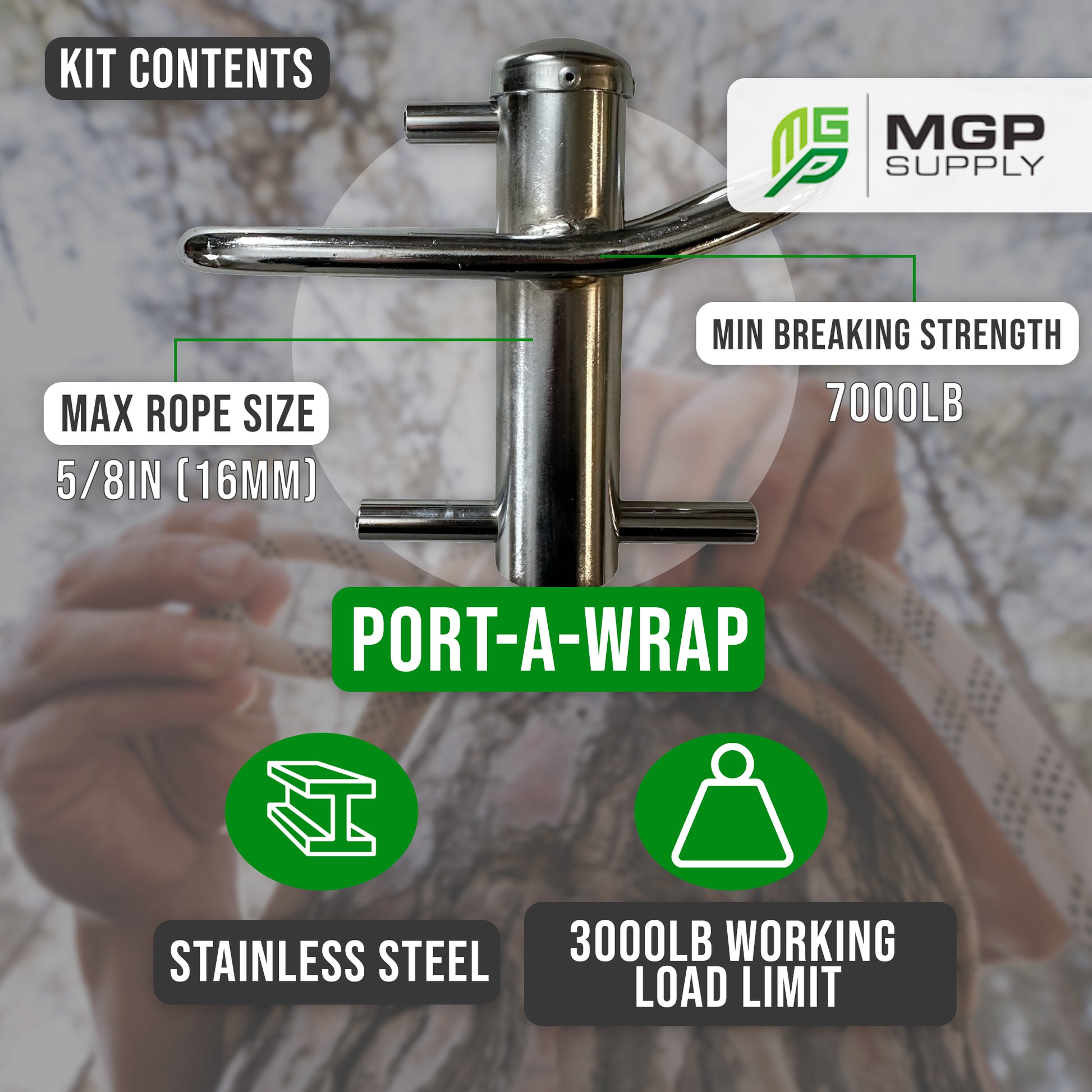 MEDIUM PORT-A-WRAP - Max rope size of 5/8in (16mm), stainless steel construction, 20,000lb work load limit, and 7000lb minimum breaking strength