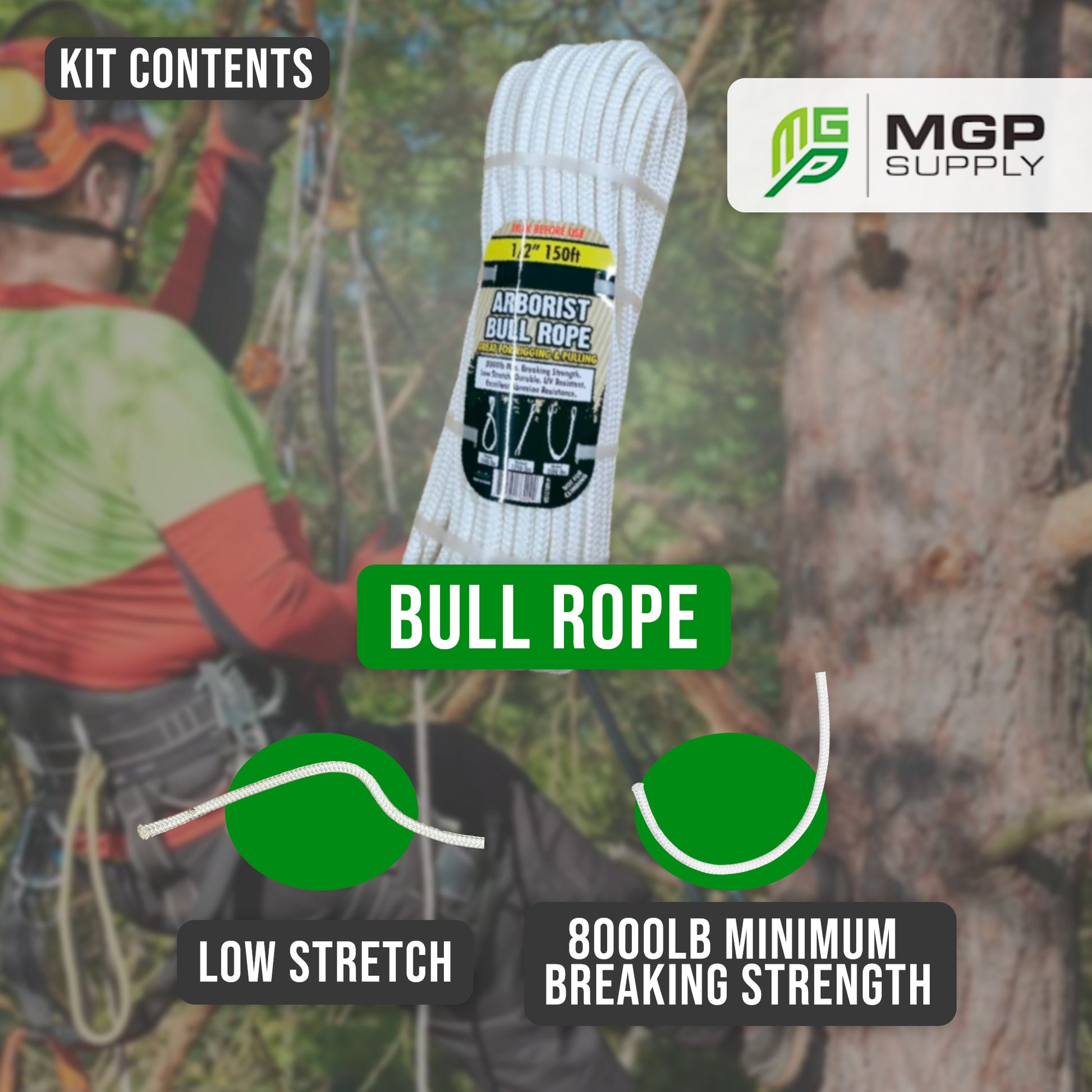 1/2IN X 150FT ARBORIST BULL ROPE - Low stretch, 8000lb minimum breaking strength, UV & abrasion resistant.