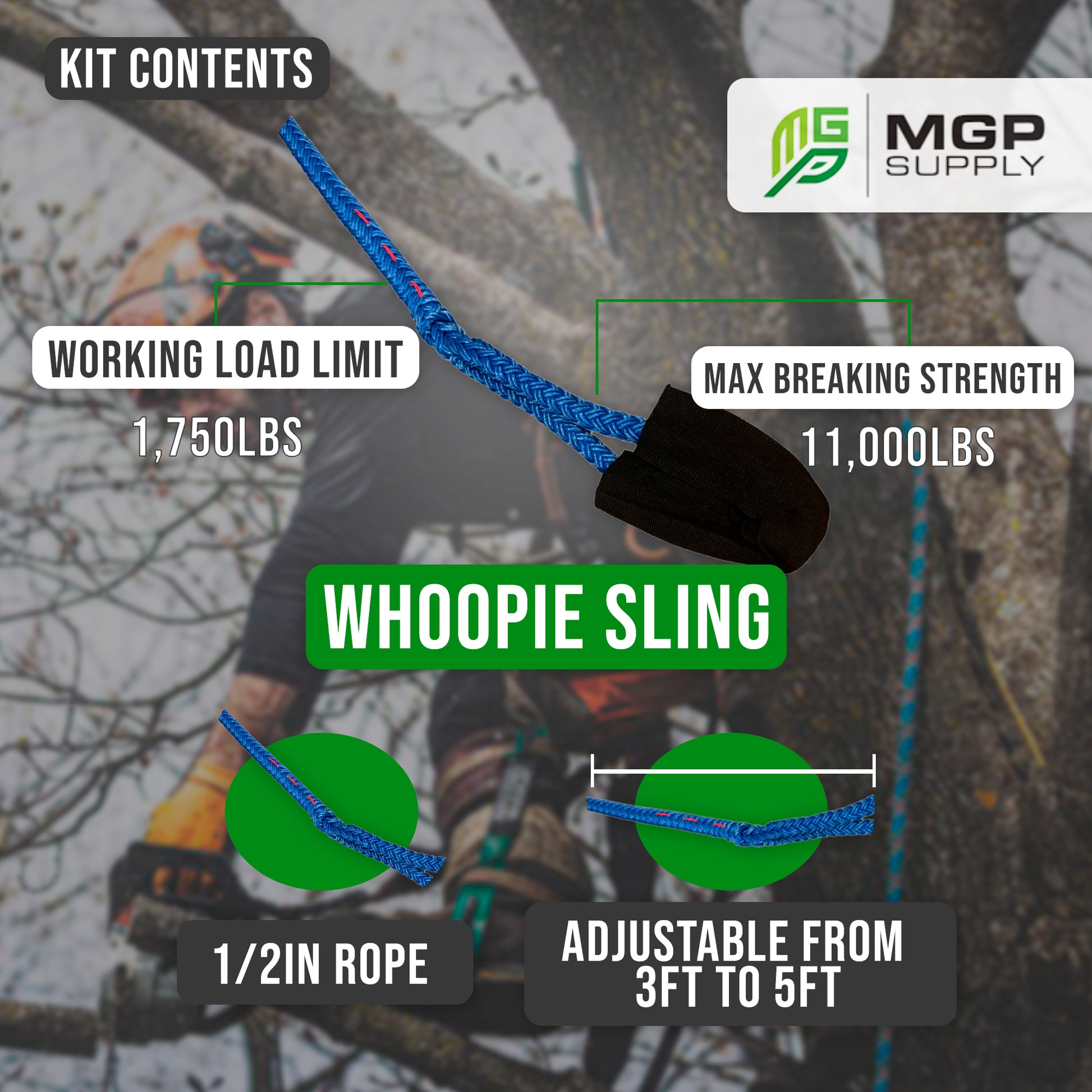 ADJUSTABLE WHOOPIE SLING - Our 1/2in whoopie sling is adjustable from 3ft to 5ft, has a working load limit of 1,750lbs and a max breaking strength of 11,000lbs.