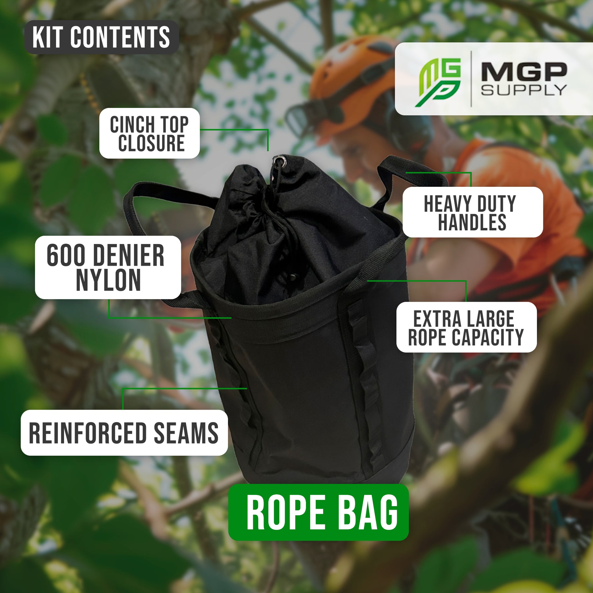 INCLUDED ARBORIST ROPE BAG - Our rope bag is crafted with 600 denier nylon, cinch top closure, heavy duty handles, reinforced seams, multiple carabiner loops, and an extra large rope capacity